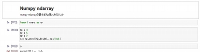 ary = np.array([1,2,3]) # データタイプ(np.bool, np.int, np.float, np.complex... np.int32, np.float64...) ary.dtype # タイプの変更 ary = ary.astype(np.float) # 配列サイズ ary = np.empty((3,5,2), dtype = np.float) ary.shape >> (3,5,2) # 配列次元 ary = np.empty((3,5,2), dtype = np.float) ary.ndim >> 3 # 要素数 ary = np.empty((3,5,2), dtype = np.float) ary.size >> 30
